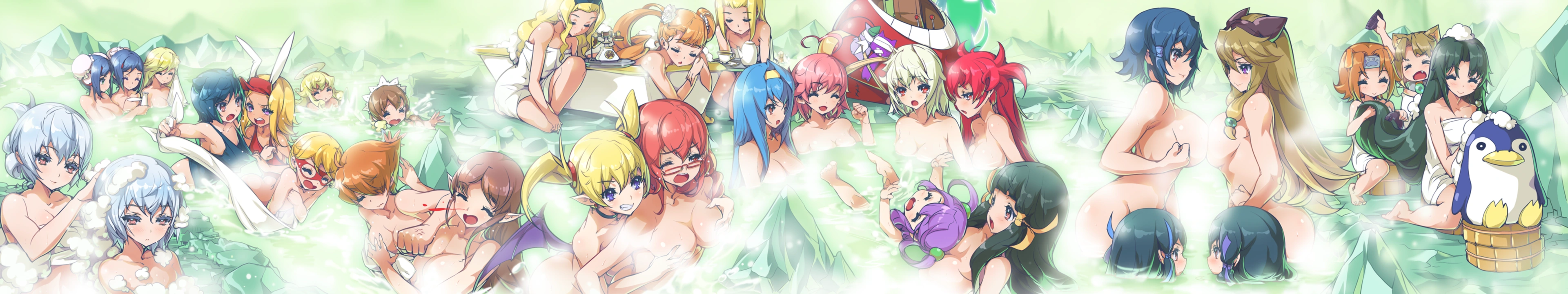 Once everyone was accounted for, the girls head to the hot spring to relax. Heart, Saki, Weiss and Scharlachrot are talking about the ping pong table they are gonna do later. Lilica is wondering if Yoriko's chest float, Clarice was gonna do the same thing with Elsa but backfired. Mei-Fang, Mei Ling and Mildred are relaxing, Mildred wondering if Mei Ling is still mad about blackmailing her into working for her (back in the first game). Angelia is attempting to drown Fiona like a submarine. Kira and Catherine are fighting over their clothing during the hot springs, while Dorothy got caught up in the middle of the fight. Zenia is washing Lieselotte's hair as Zenia sorta remembered this moment before, Lieselotte told Zenia about her birthday and wondering if she has free time. Heart is asking Petra to join in, but Petra is relaxing in a tub. Akane and Tsuzune are having competition of their chest while Koito and Kouta watches. Konoha and Nazuna are brushing Kamui's hair, while Kamui washing a penguin plush she was keeping over the years. Michelangelo and Merlin are tied to Yodogawa while Kazu is trying not to peek in the hot spring.